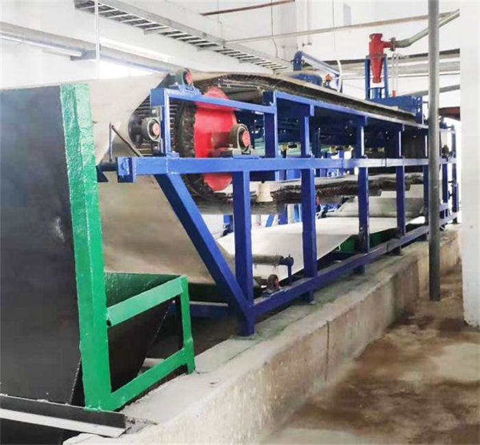 以滤布为过滤介质,采用整体的环形橡胶带作为真空室。环形橡胶带由传动装置传动做直线运行,通过密封系统实现料浆的固液分离。当真空系统介入时,固体被载流在滤带上通过刮刀卸除,液体被自动排液罐接收并通过水封装置或切换装置排出,滤布经过高压冲洗液在线连续清洗获得再生。实现物料从进料、脱水、顺逆流洗涤、卸渣、滤液排放、滤布清洗和纠偏不间断的连续进行。