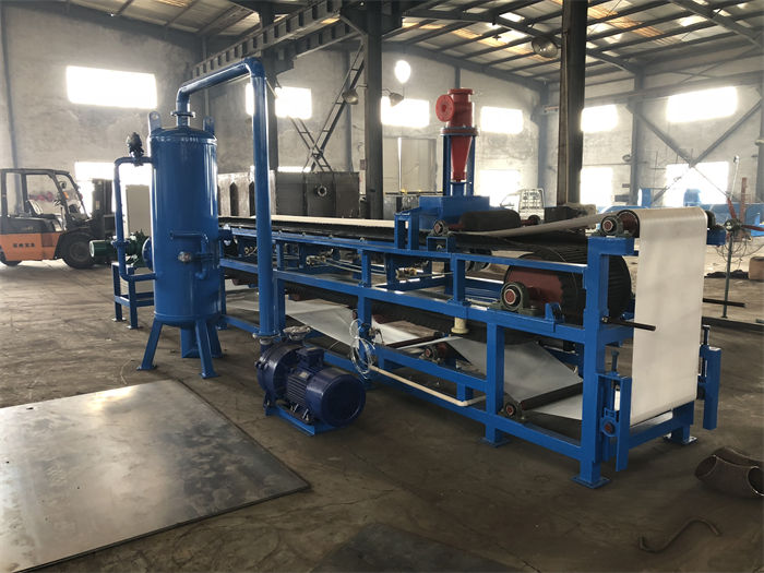 以滤布为过滤介质,采用整体的环形橡胶带作为真空室。环形橡胶带由传动装置传动做直线运行,通过密封系统实现料浆的固液分离。当真空系统介入时,固体被载流在滤带上通过刮刀卸除,液体被自动排液罐接收并通过水封装置或切换装置排出,滤布经过高压冲洗液在线连续清洗获得再生。实现物料从进料、脱水、顺逆流洗涤、卸渣、滤液排放、滤布清洗和纠偏不间断的连续进行。